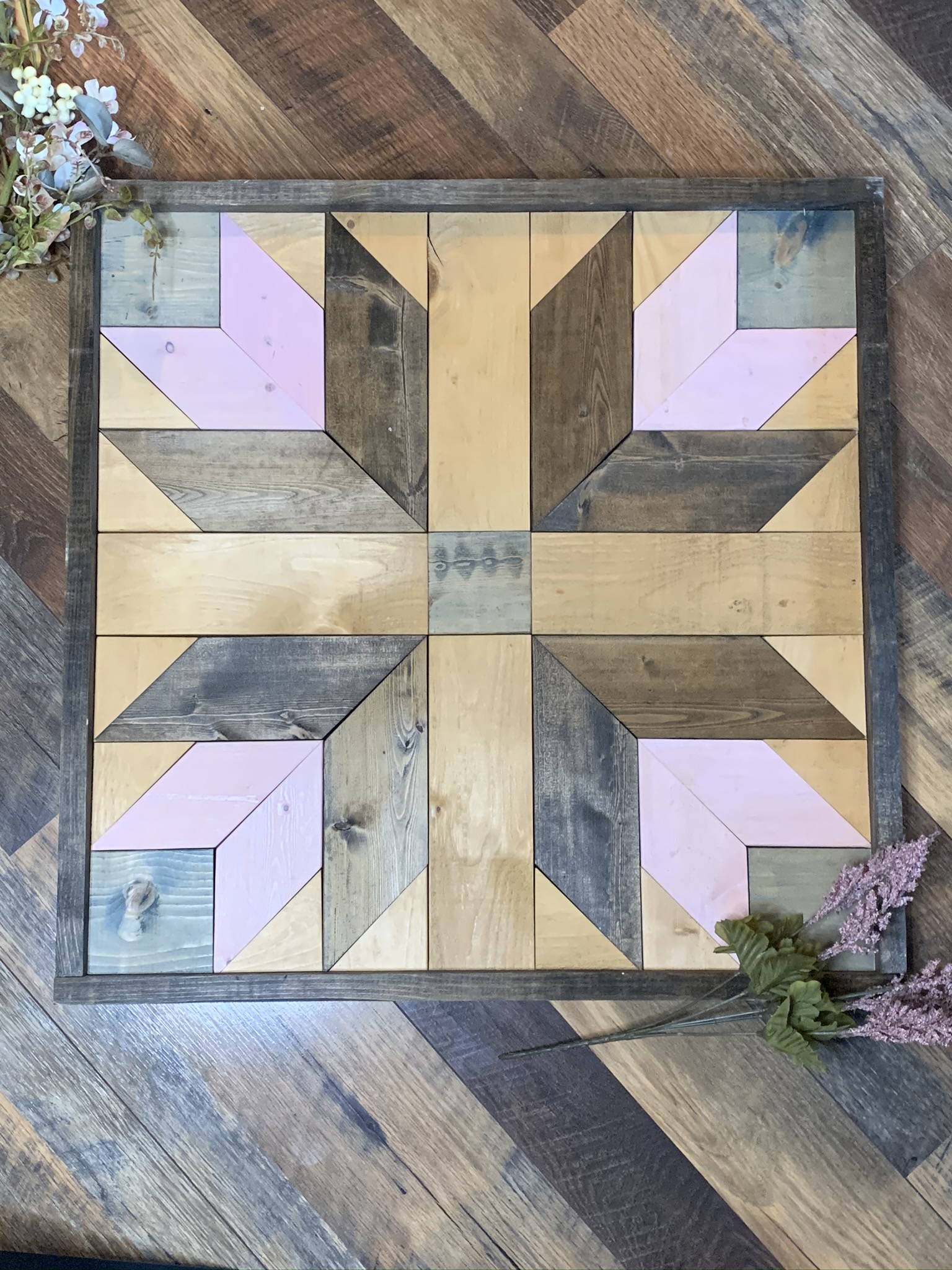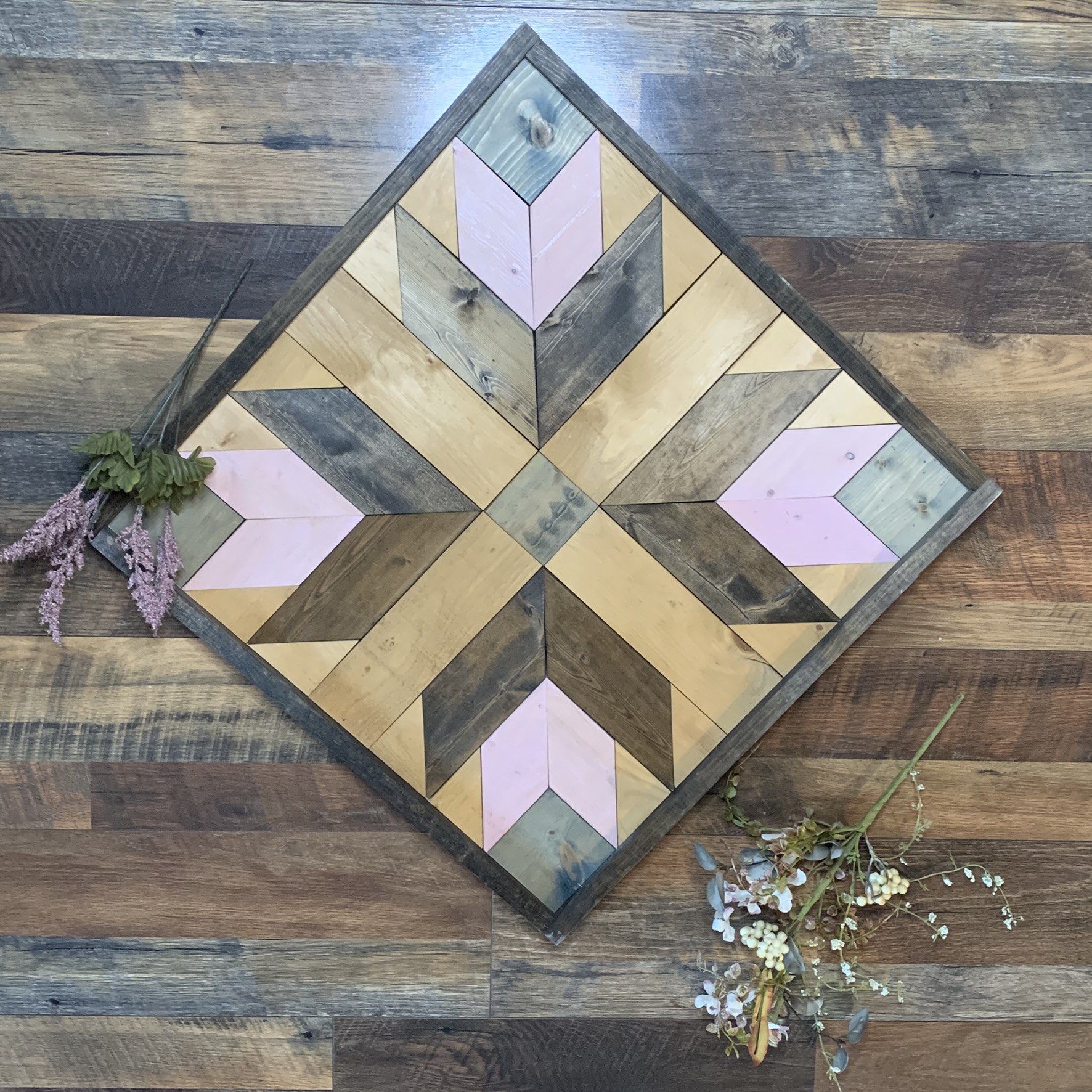 The 4-Corners barn quilt is 24″ x 24″. This custom piece has been hand cut, sanded, stained, glued, and finished with a rustic reclaimed pine frame. Each quilt block is named for its personality and design. Pieces are finished with three coats of ureathen to protect it from the elements so you can hang your masterpiece inside or out. For best results re-seal the work every 5 years to continue to protect from the damages that rain, snow, and sun can cause. Each barn quilt has mounting hardware on the back which allows for a stright or diagonal orientation to display the work. I take great pride in each piece that I handcraft and you can be assured that they are solidly constructed and a great addition to your home decor.